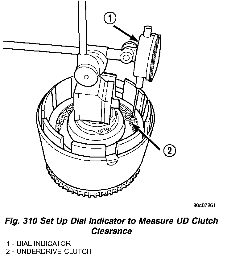 16. Set up dial indicator on the UD clutch pack as shown in (Fig. 310).