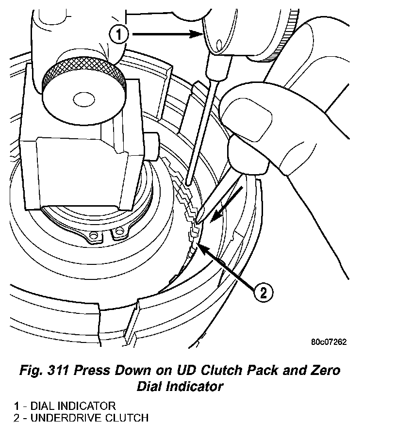 17. Using moderate pressure, press down and hold (near indicator) the UD clutch pack with screwdriver or suitable tool and zero dial indicator (Fig. 311). When releasing pressure on clutch pack, indicator reading should advance 0.005-0.010.