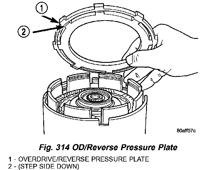 23. Install the OD/Reverse pressure plate with large step down (towards OD clutch pack) (Fig. 314).