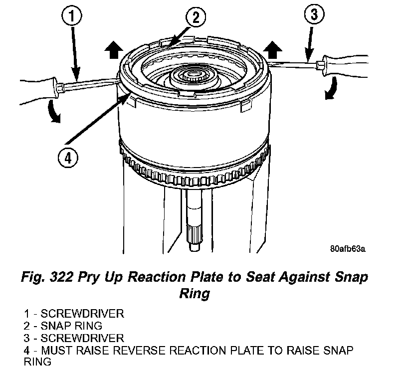 31. Pry up reverse reaction plate to seat against snap ring (Fig. 322).