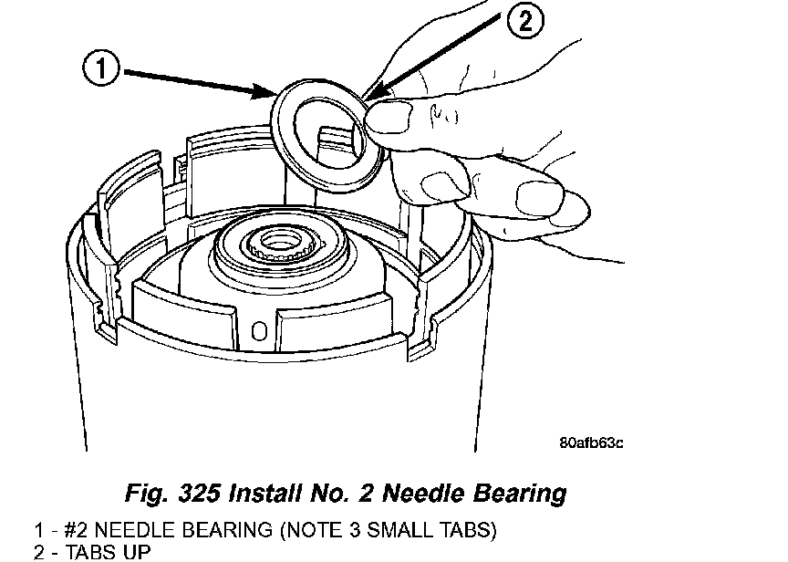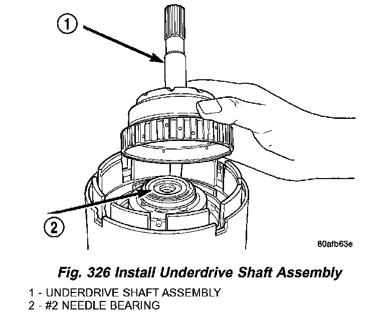 39. Install the #3 thrust washer to the underdrive shaft assembly. Be sure five tabs are seated properly (Fig. 327).