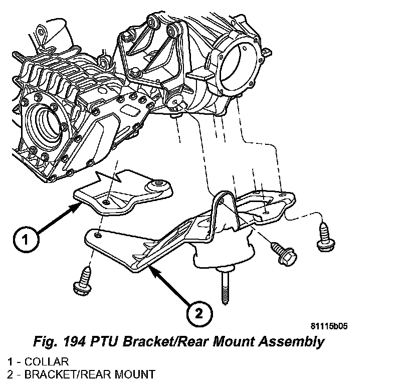 6. Install PTU/rear mount bracket. Install and torque six (6) bolts to 54 Nm (40 ft. lbs.). (Fig. 194).