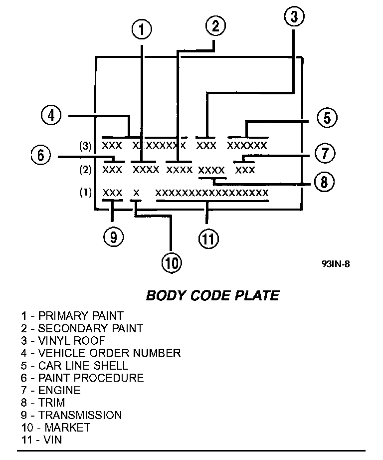 The Body Code Plate is located in the engine compartment on the driver side strut tower. There are seven lines of information on the body code plate. Lines 4, 5, 6, and 7 are not used to define service information. Information reads from left to right, starting with line 3 in the center of the plate to line 1 at the bottom of the plate.