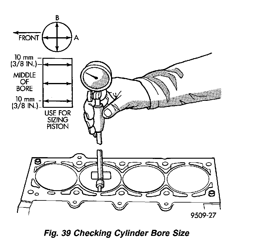 Measure the cylinder bore at three levels in directions A and B (Fig. 39). Top measurement should be 10 mm (3/8 inch) down and bottom measurement should be 10 mm (3/8 inch) up from bottom of bore. Refer to SPECIFICATIONS.