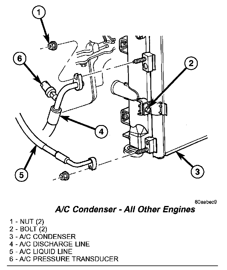 NOTE: If the A/C condenser is being replaced, add 30 milliliters (1 fluid ounce) of refrigerant oil to the refrigerant system. Use only refrigerant oil of the type recommended for the A/C compressor in the vehicle.