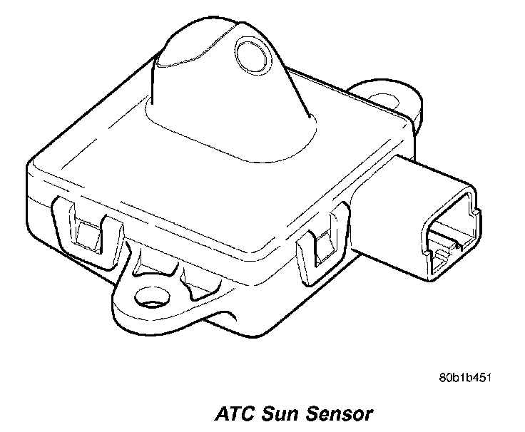 The sun sensor is not a thermistor type sensor, but rather a photo diode. For this reason the sun sensor responds to sun light intensity rather than temperature. The sun sensor is used to aid in determining proper mode and blend door positions and blower motor speed. The sun sensor is also used to sense day and night conditions for automatic headlight control, if equipped. The sun sensor has an LED indicator for the vehicle security system, if equipped.