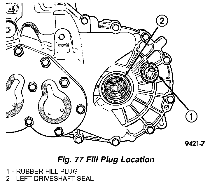 All T350 transaxles are equipped with a fill plug. The fill plug is located on the left side of the transaxle differential area (Fig. 77). The fluid level should be within 3/16 inch from the bottom of the transaxle fill hole (vehicle must be level when checking).