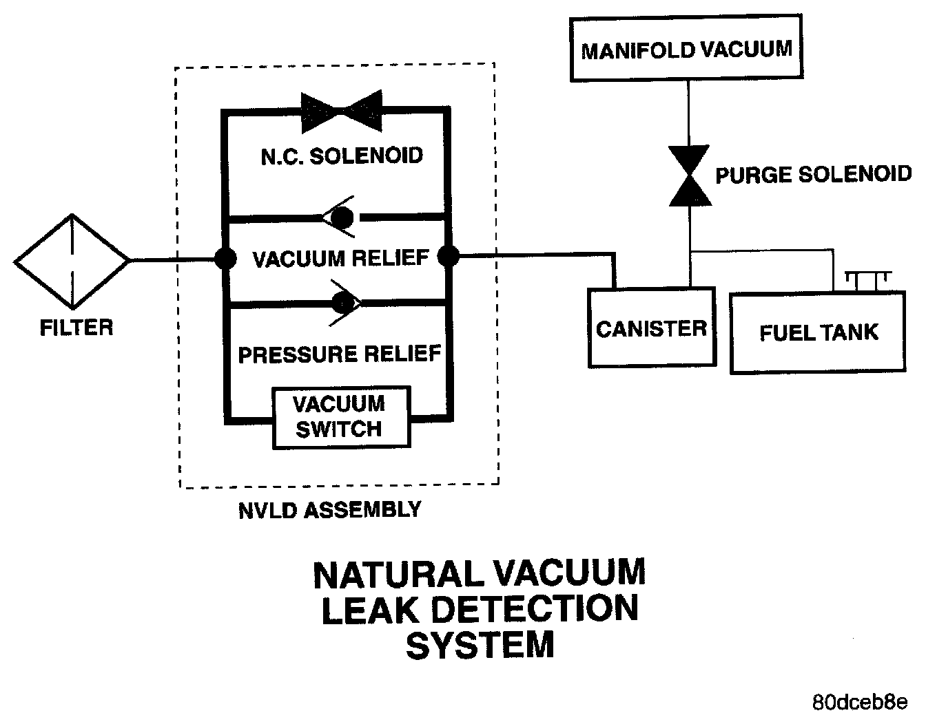 The Natural Vacuum Leak Detection (NVLD) system is the next generation evaporative leak detection system that will first be used on vehicles equipped with the Powertrain Control Module (PCM) or Next Generation Controller (NGC) starting in 2002 M.Y. This new system replaces the leak detection pump as the method of evaporative system leak detection. The current CARB requirement is to detect a leak equivalent to a 0.020 inches (0.5 mm) hole. This system has the capability to detect holes of this size very dependably.