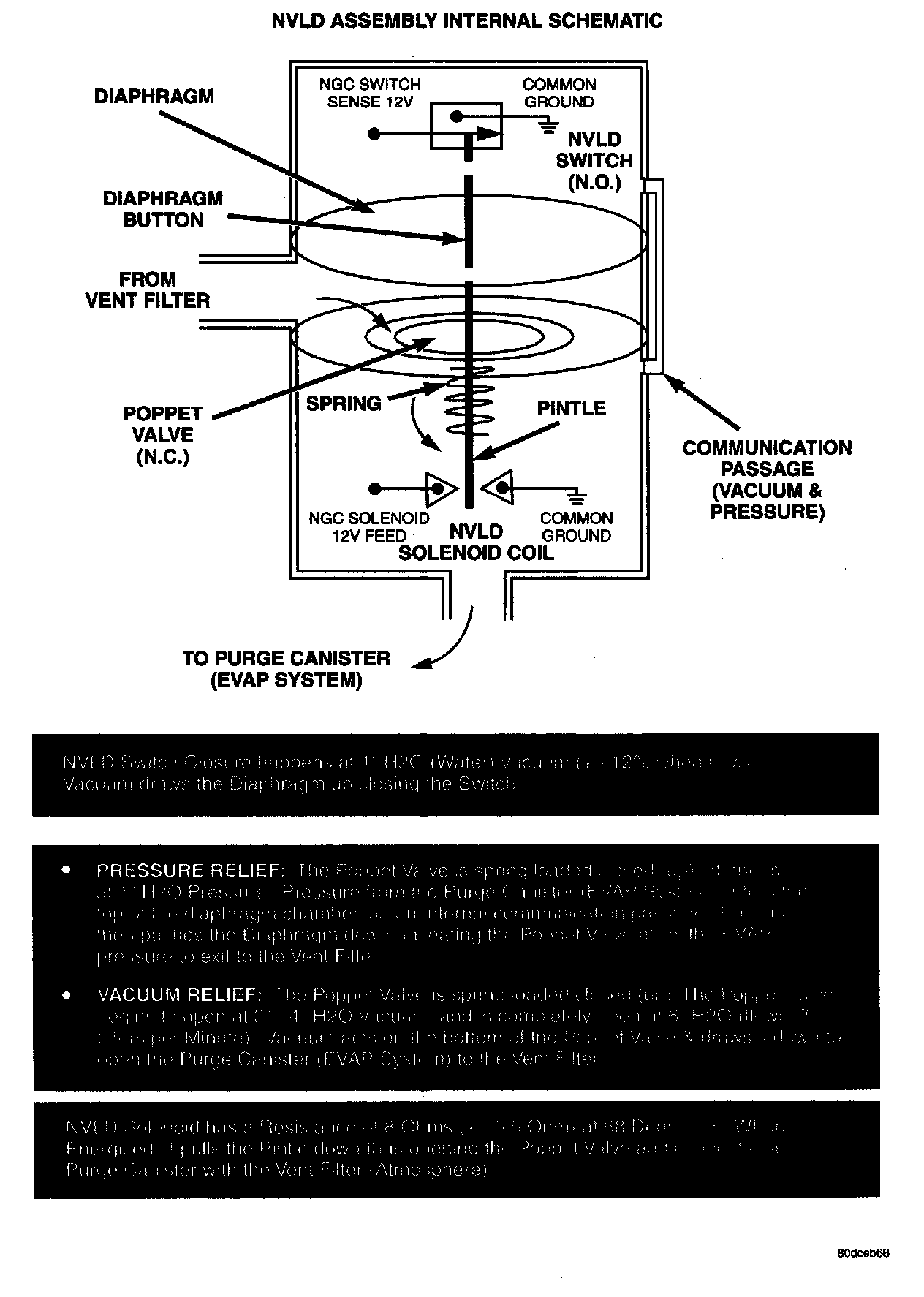 The normally closed valve in the NVLD is intended to maintain the seal on the evaporative system during the engine off condition. If vacuum in the evaporative system exceeds inches to 6 inches H20 (0.75 to 1.5 KPA), the valve will be pulled off the seat, opening the seal. This will protect the system from excessive vacuum as well as allowing sufficient purge flow in the event that the solenoid was to become inoperative. The solenoid actuates the valve to unseal the canister vent while the engine is running. It also will be used to close the vent during the medium and large leak tests and during the