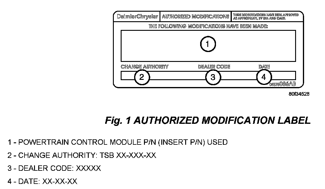 13. Type the necessary information on the "Authorized Modification Label p/n 04275086AB and attach near the VECI label (Fig. 1).