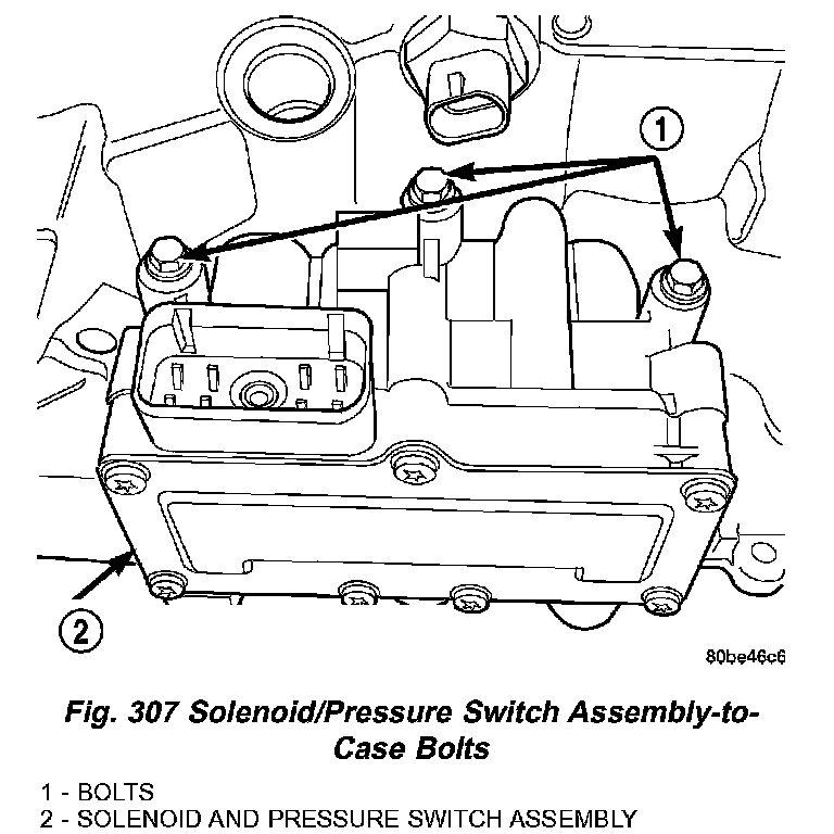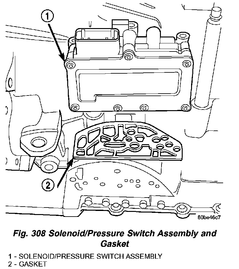 7. Remove solenoid/pressure switch assembly and gasket (Fig. 308). Use care to prevent gasket material and foreign objects from become lodged in the transaxle case ports.
