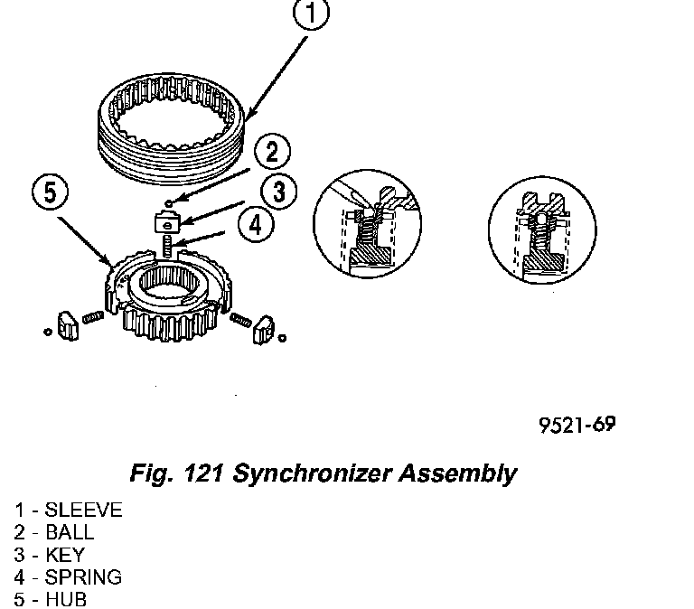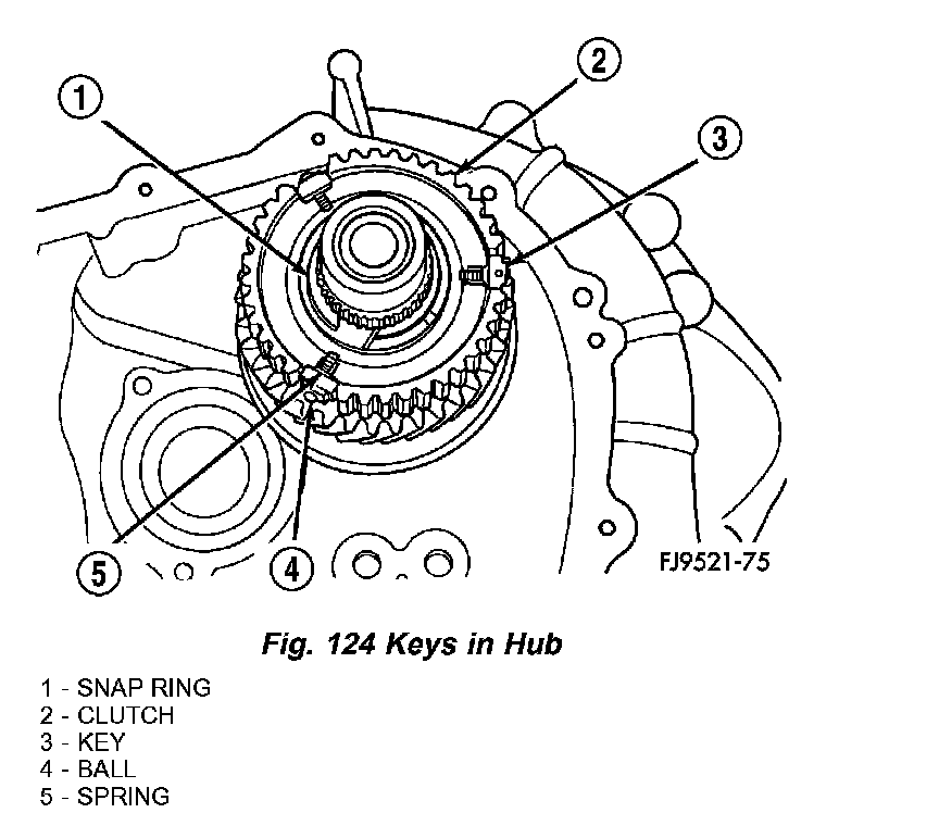 6. Line up stop ring tang over the keys in the hub (Fig. 124). Install stop rings. Center the keys and balls by pushing on both stop rings.