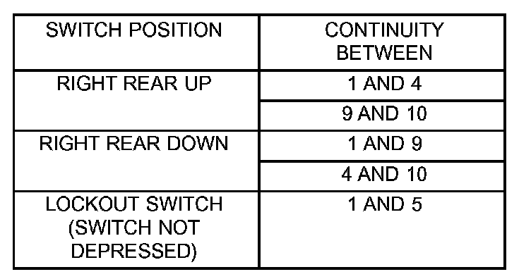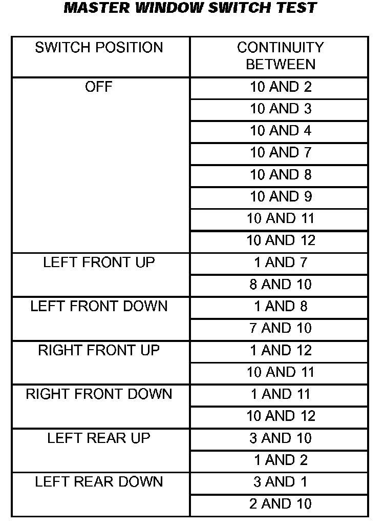 For switch testing, remove the switch. Using an ohmmeter, refer to Window Switch Continuity Charts to determine if continuity is correct. If the results are not obtained, replace the switch.