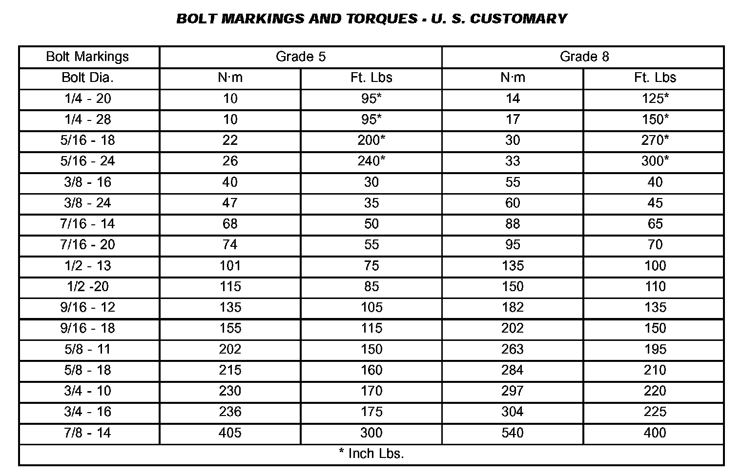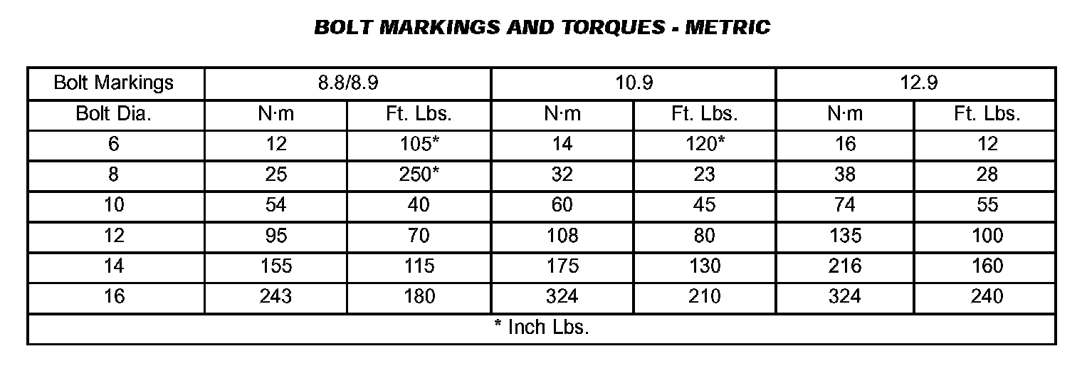 The SAE bolt strength grades range from grade 2 to grade 8. The higher the grade number, the greater the bolt strength. Identification is determined by the line marks on the top of each bolt head. The actual bolt strength grade corresponds to the number of line marks plus 2. The most commonly used metric bolt strength classes are 9.8 and 10.9. The metric strength class identification number is imprinted on the head of the bolt. The higher the class number, the greater the bolt strength. Some metric nuts are imprinted with a single-digit strength class on the nut face. Refer to the Fastener Identification and Fastener Strength Charts.