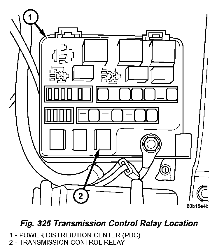 The transmission control relay (Fig. 325) is located in the Power Distribution Center (PDC), which is located on the left side of the engine compartment.