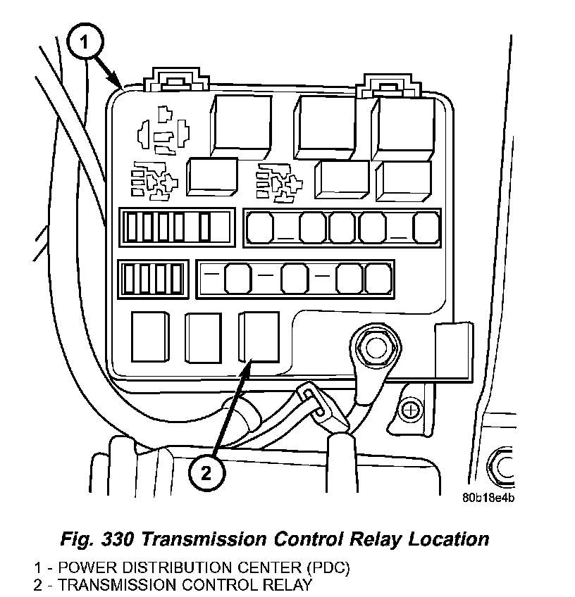 The transmission control relay (Fig. 330) is located in the Power Distribution Center (PDC), which is located on the left side of the engine compartment.