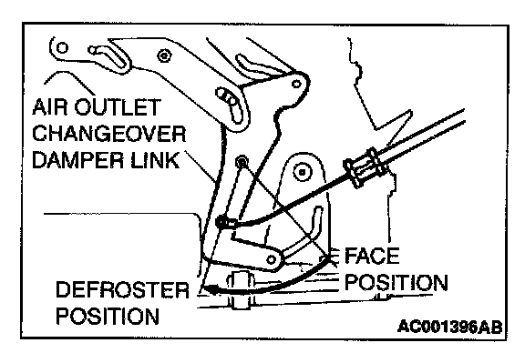 2. Set the air outlet changeover damper link of the heater/ cooler unit to the defroster position as shown in the illustration, and then connect the cable to the link pin.