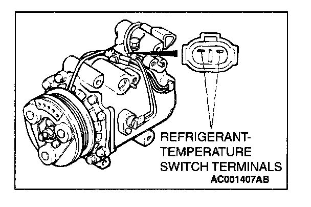 When the A/C is off, check that there is continuity between the refrigerant-temperature switch terminals. If not, replace the switch.