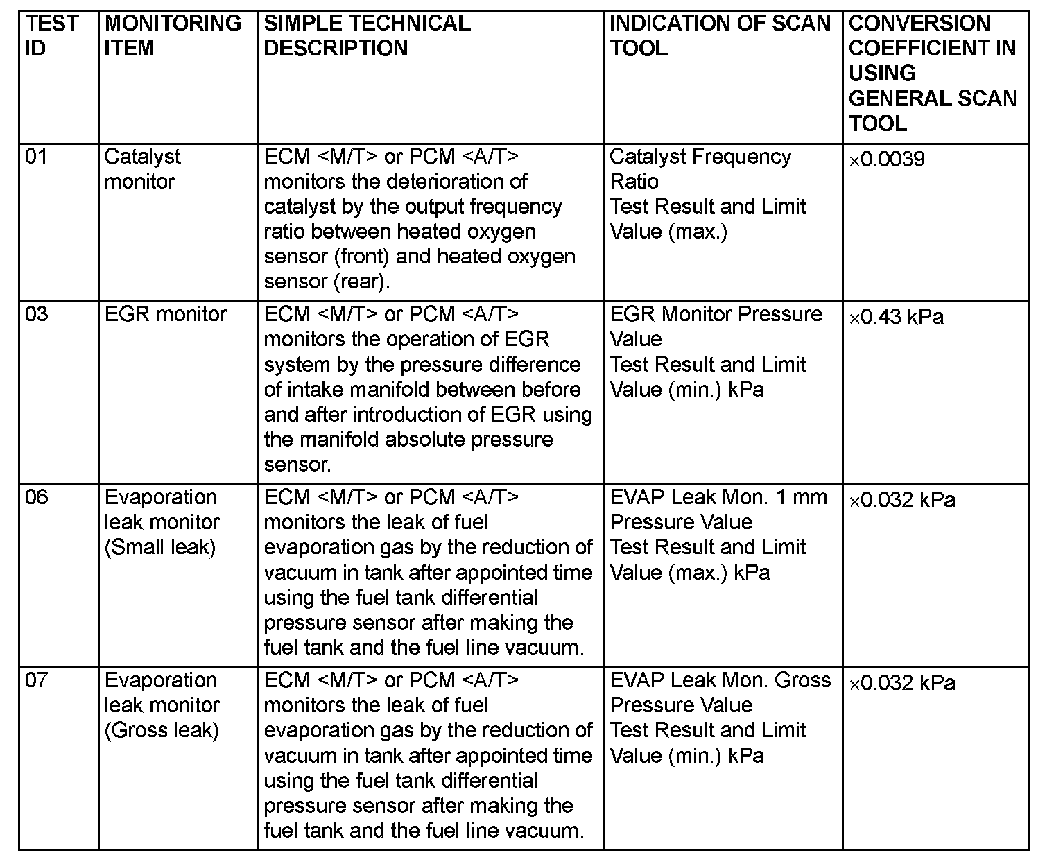 Mode 6 Reference Table (Emission Control System)