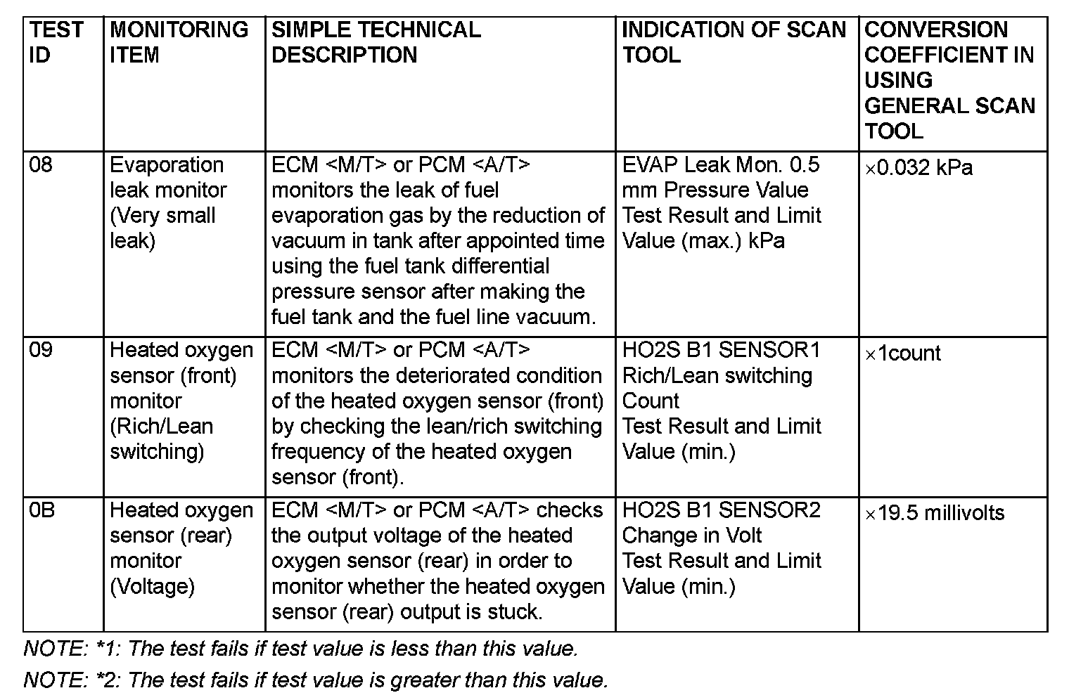 By selecting MODE 6 using scan tool, Test Result and Limit Value (minimum) *1 or (maximum) *2 about the main items of emission control system which ECM
