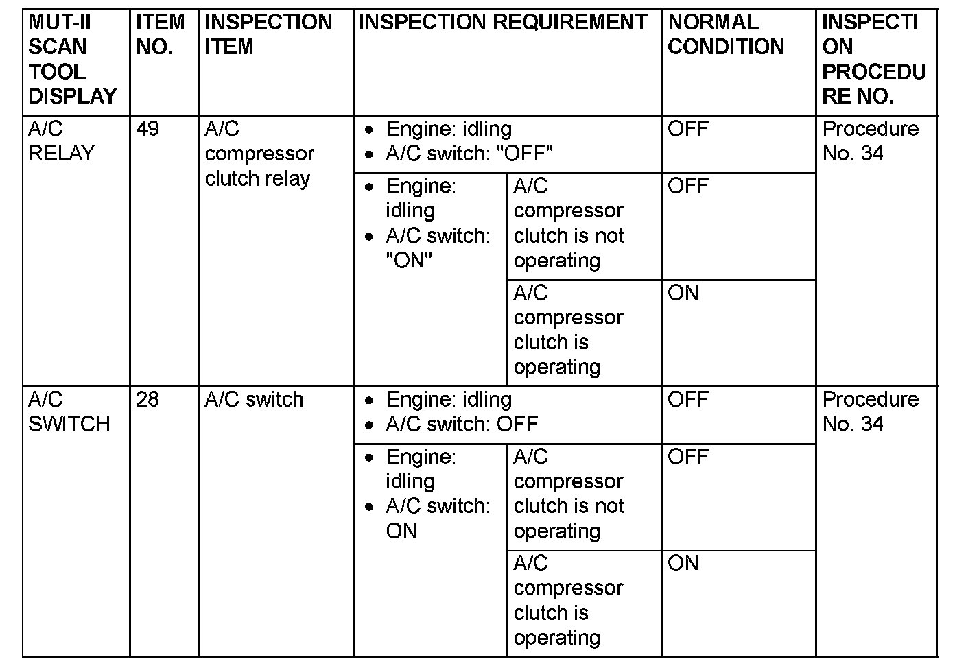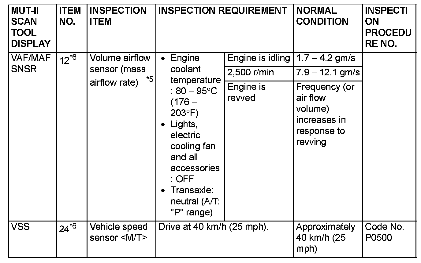 - *6: GST items. [Data list items consist of MUT-II items and GST items. GST items can be accessed through the use of a general scan tool (GST). When scan tool MB991502 (MUT-II) is used, MUT-II items appear alphabetically; then, GST items appear alphabetically. The black and white characters of the GST items are inverted from the MUT-II items.]