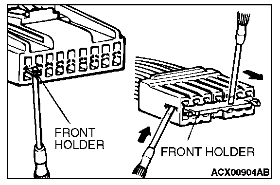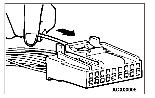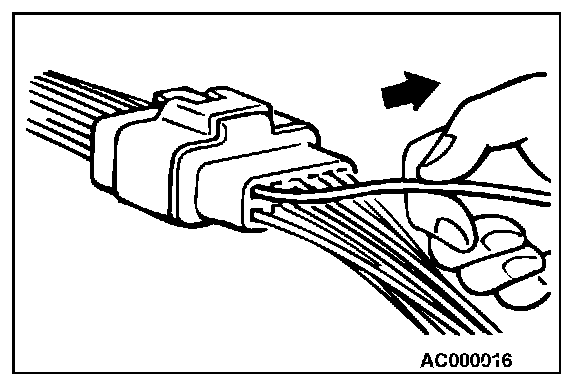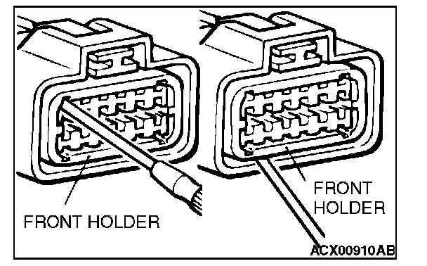 2. If the connector is disconnected for checking and the facing part is the female pin side, use an appropriate male terminal for checking the contact pressure of connector pins (such as MB991219).