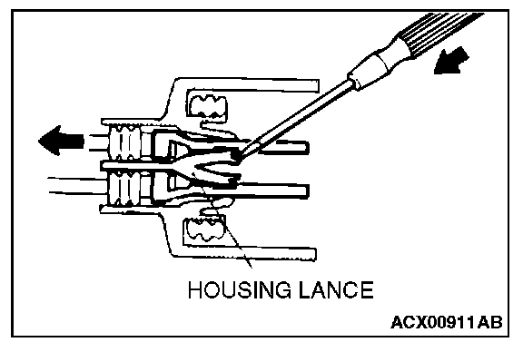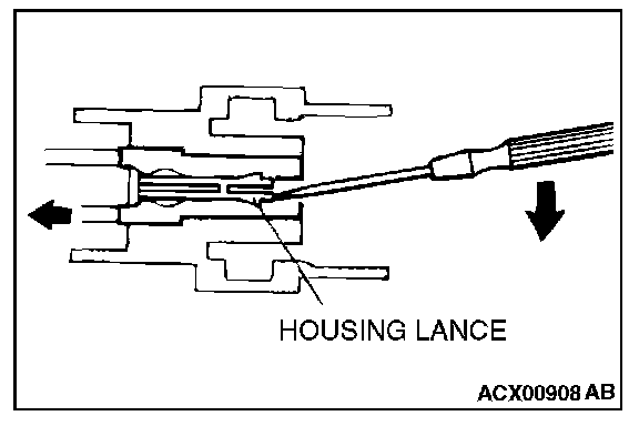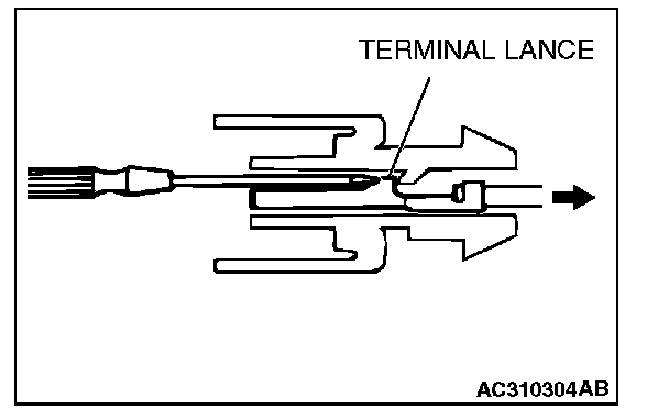 Loosely engaged terminals can be repaired by removing the female terminal from the connector housing and raising its lance to establish better engagement. Removal of the connector terminal used for MFI and INVECS-II A/T control circuits can be done in the following manner.