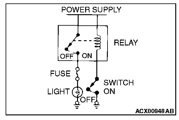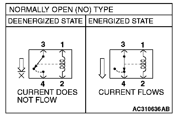 2. The normally closed-type When a normally closed relay as illustrated here is checked, there should be continuity between terminals 3 and 4 when the relay is deenergized. There should be no continuity between terminals 3 and 4 when battery voltage and ground are applied to terminals 1 and 2. The relay condition is determined by this check.