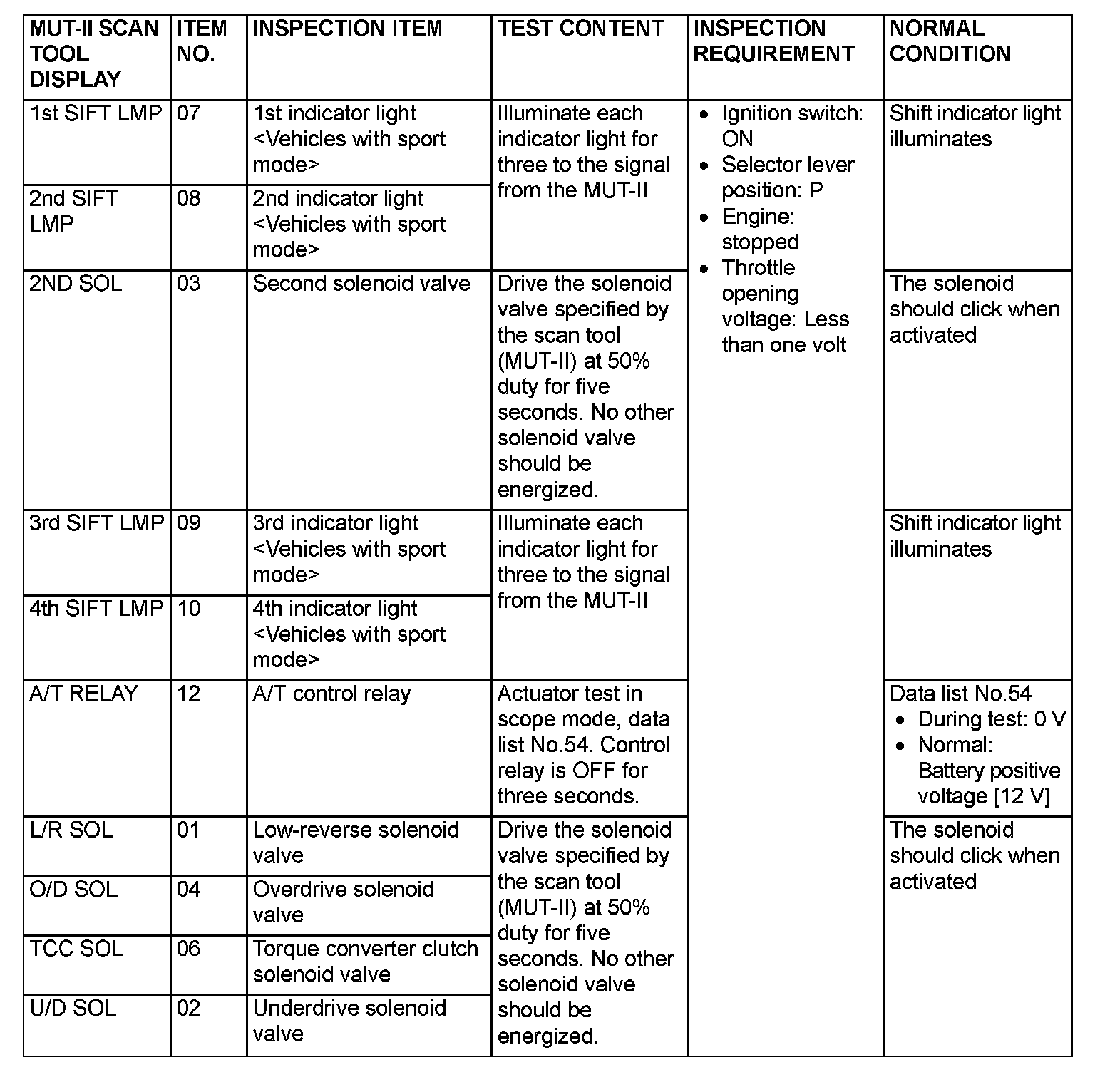Actuator Test Reference Table