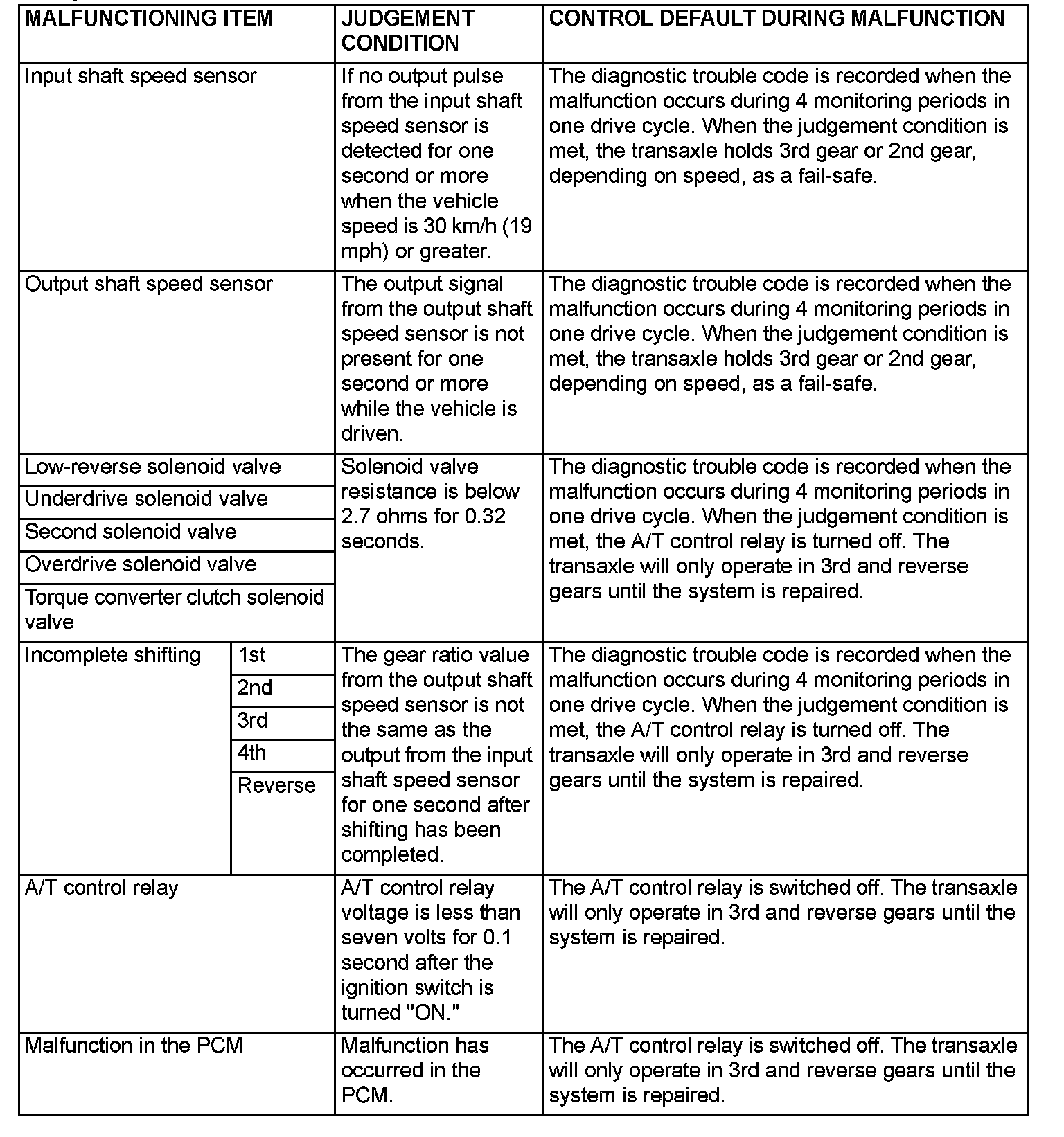 FAIL-SAFE/BACKUP FUNCTIONWhen a malfunction of a main sensor or actuator is detected by the PCM, the transaxle is controlled by pre-set control logic to maintain safe conditions for driving.