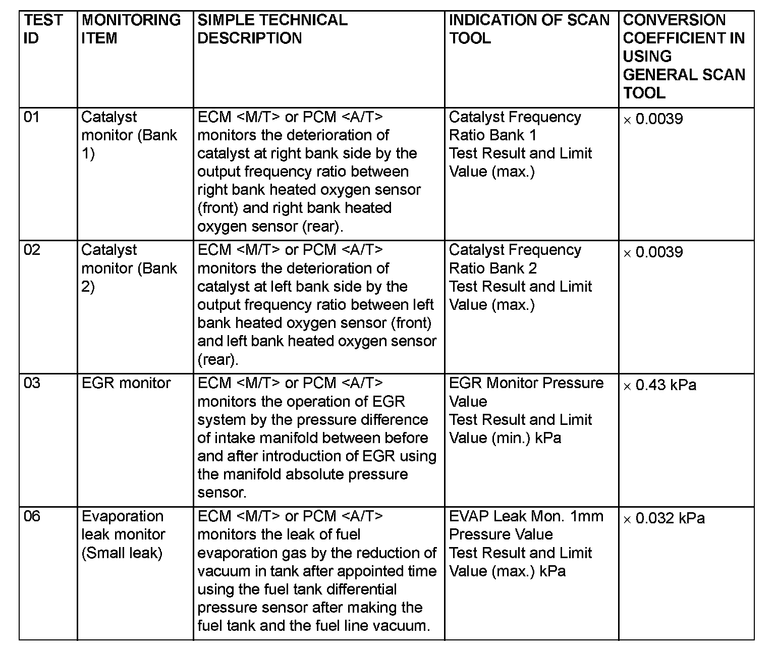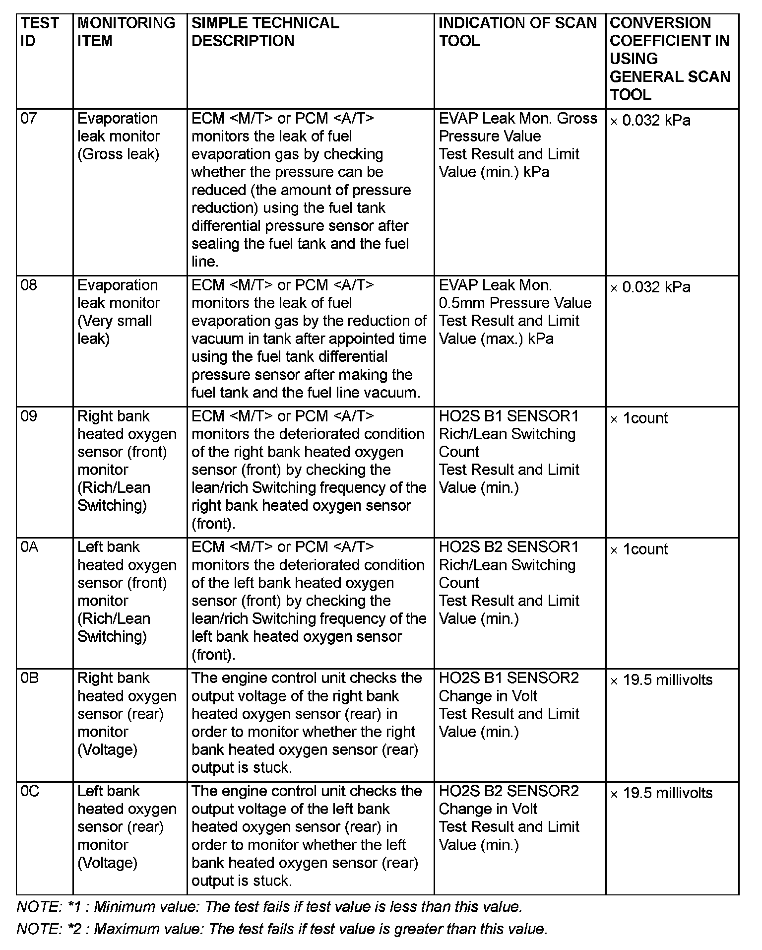 monitors the condition of emission control system. By selecting MODE 6 using scan tool, Test Result and Limit Value (minimum) *1 or (maximum) *2 about the main items of emission control system which ECM