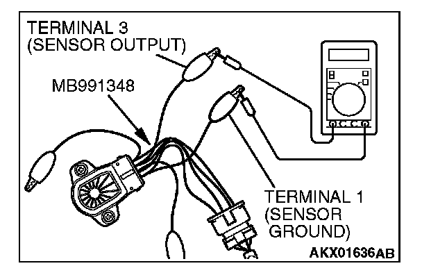 2. Connect a digital voltmeter between throttle position sensor terminal No.3 (sensor output) and terminal No.1 (sensor ground).