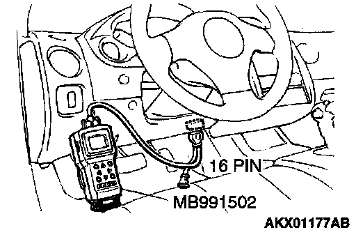 CAUTION: To prevent damage to scan tool MB991 502, always turn the ignition switch to the "LOCK" (OFF) position before connecting or disconnecting scan tool MB991502.
