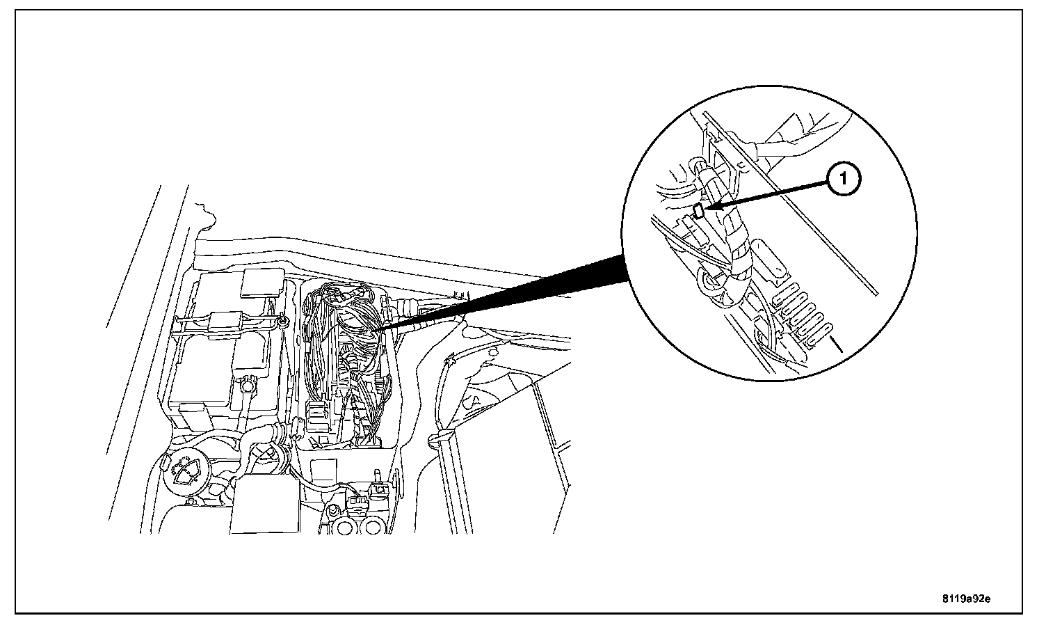 3. Move the wires away to the side of the box to access the clip (1) that holds the relay control module in the control module box.