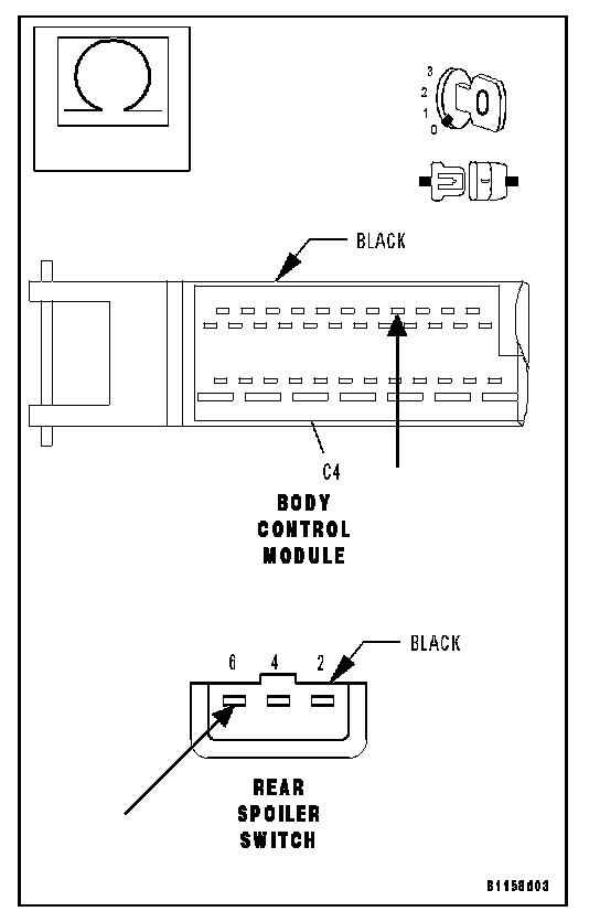 Measure the resistance between ground and the Rear Spoiler Switch Sense at the BCM C4 harness connector.