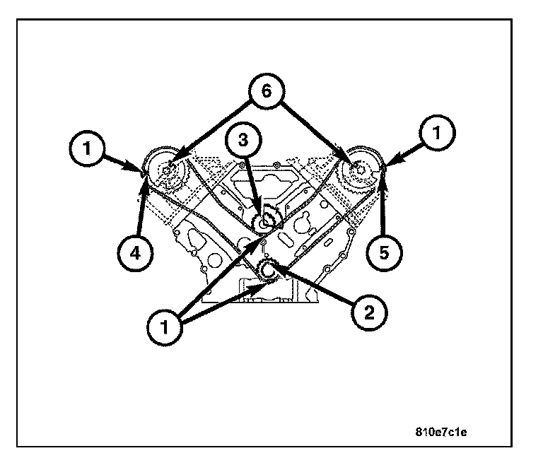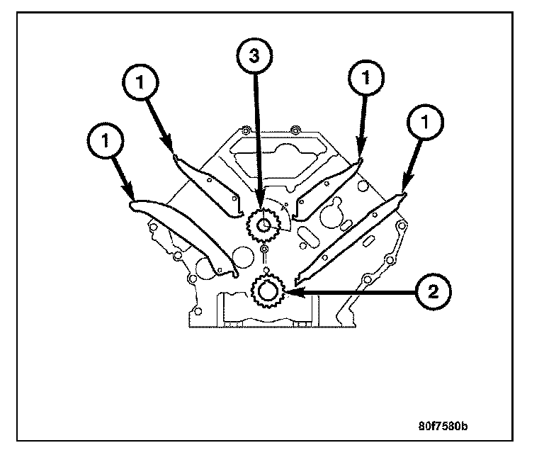 2. Remove the timing chain guides (1) off of the mounting pins. Inspect and replace worn or damaged guides as required.
