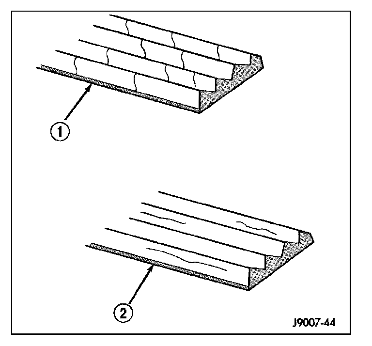 The accessory drive belt may develop minor cracks across the ribbed side (1) due to reverse bending. These minor cracks are considered normal and acceptable. Parallel cracks (2) are not considered normal and should be cause for belt replacement.