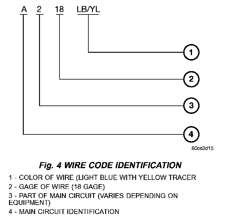 Each wire shown in the diagrams contains a code which identifies the main circuit, part of the main circuit, gage of wire, and color (Fig. 4).