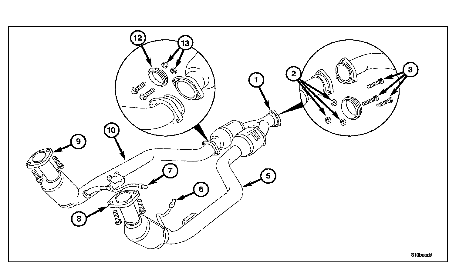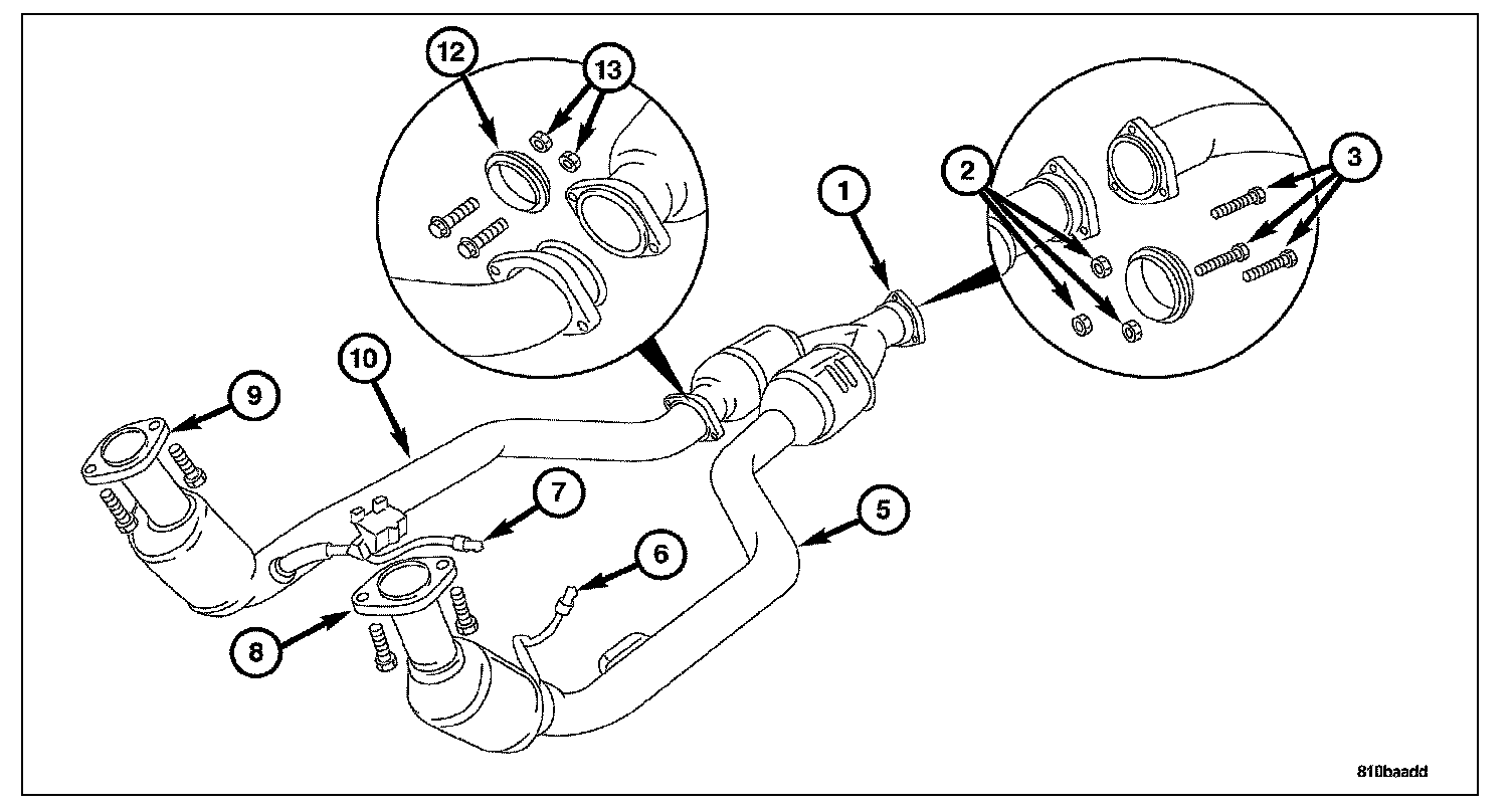 6. Remove the left and right side exhaust pipes from the vehicle (5 and 10).