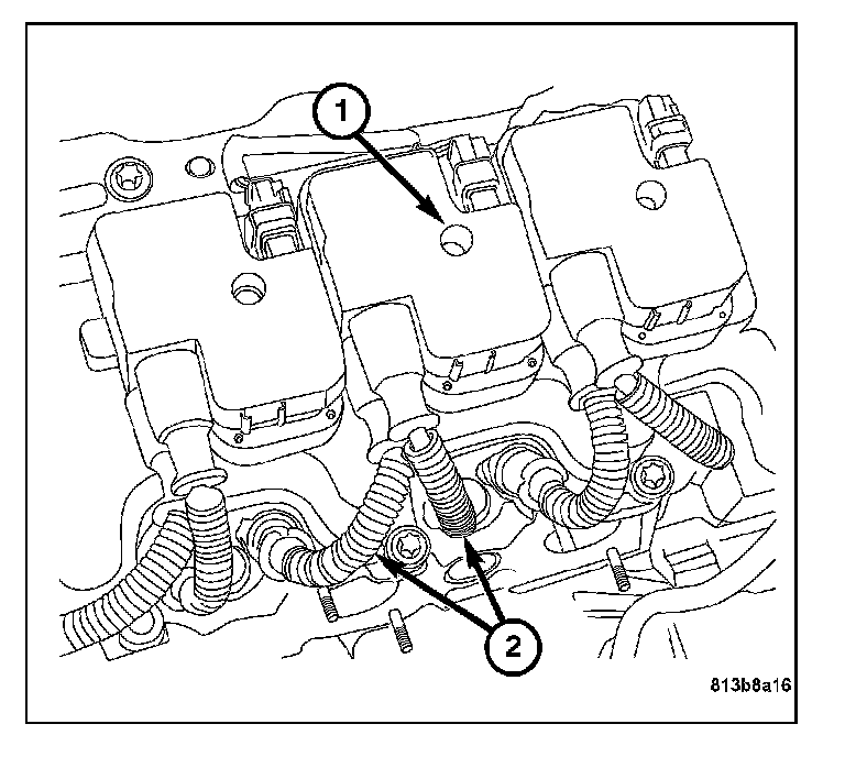 2. Clean the cylinder head spark plug recesses (2) using low pressure compressed air.
