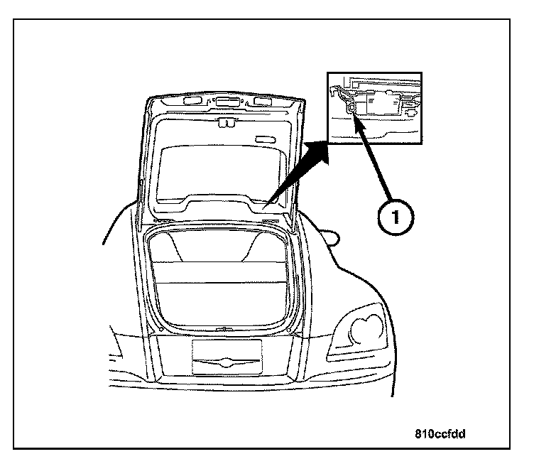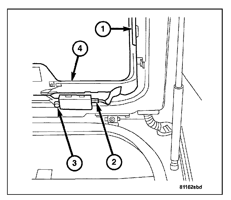 1. Install the rear window antenna module to the lift-gate and attach with the retaining screw (3) and secure.