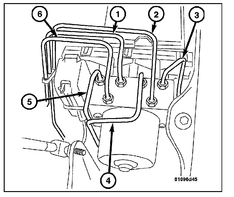 3. Disconnect the hydraulic lines (1-6) from the HCU. Cap the hydraulic lines and connections with plugs.