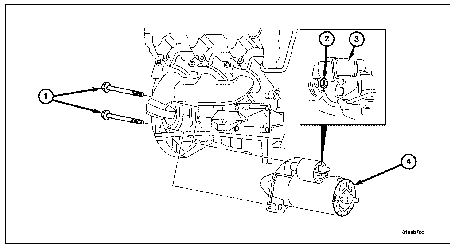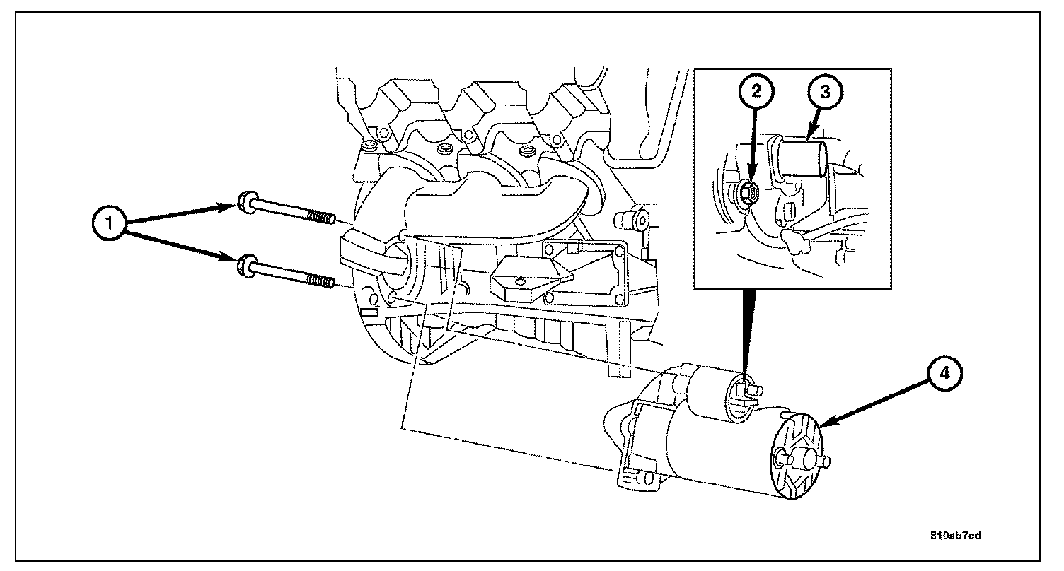 6. Remove the starter bolts (1) and reposition the starter to access the starter electrical cables.