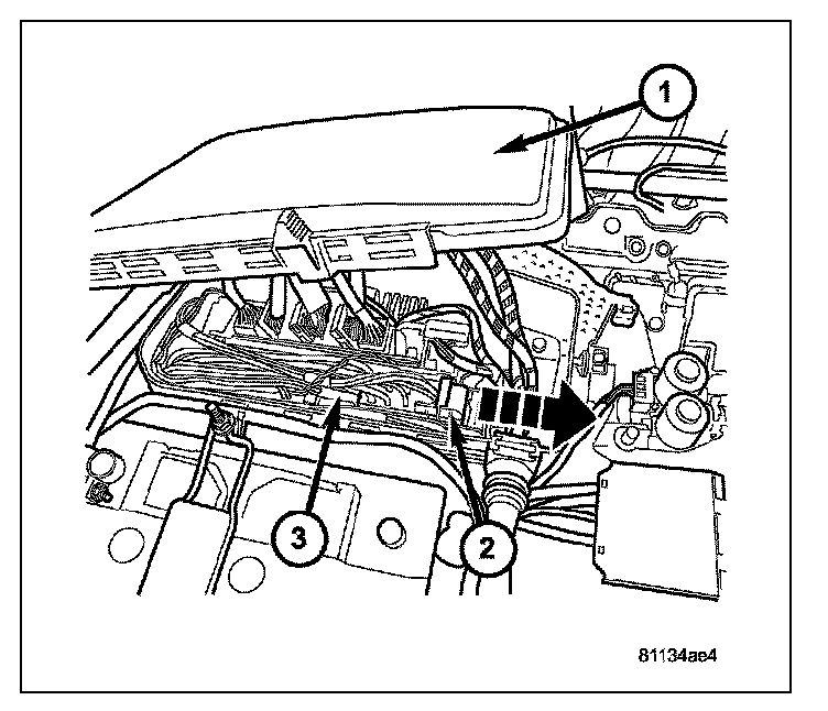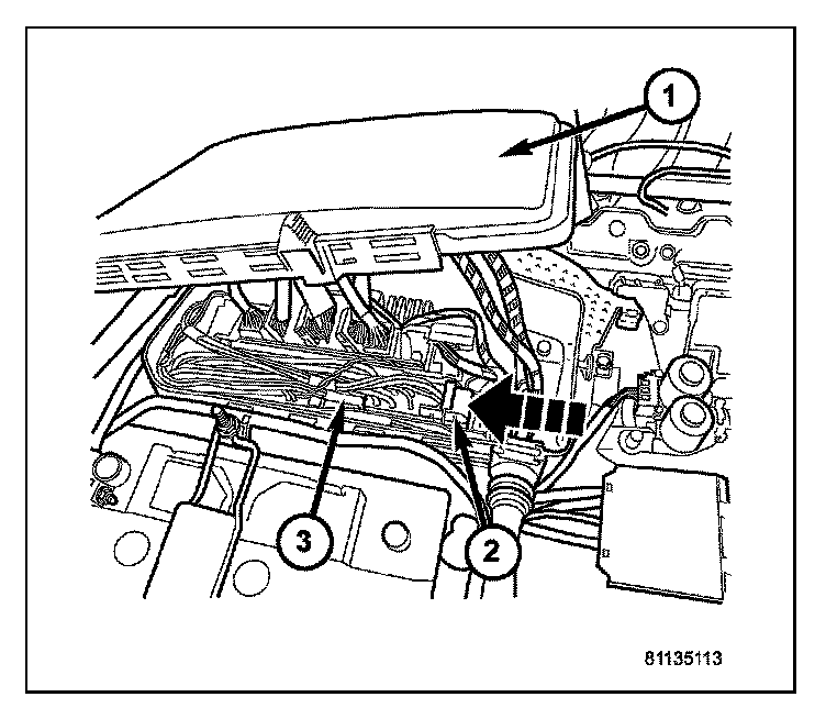 5. Unlock and disconnect the wiper motor harness connector (2) from the Body Control Module (BCM) (3).