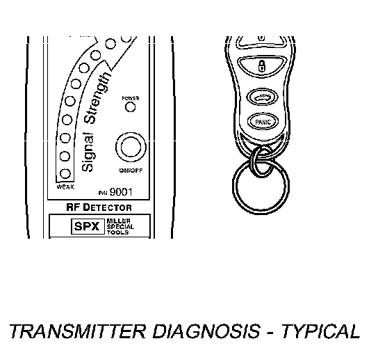 Using special tool 9001, first test to ensure that the transmitter is functioning. Typical testing distance is 2.5 centimeters (1 inch) for Asian transmitters and 30.5 centimeters (12 inches) for all others. To test, position the transmitter. Press any transmitter button, then test each button individually. The tool will beep if a radio signal strength that lights five or more LED's is detected. Repeat this test three times. If transmitter fails of the test, refer to the diagnostic procedures.