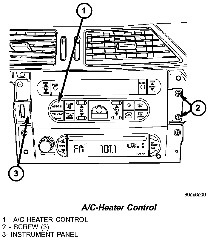 3. Remove the three screws that secure the A/C heater control to the instrument panel.