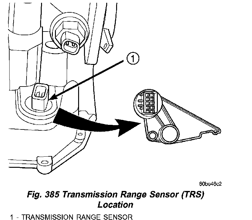 The Transmission Range Sensor (TRS) (1) (Fig. 385) is mounted to the top of the valve body inside the transaxle and can only be serviced by removing the valve body The electrical connector extends through the transaxle case.