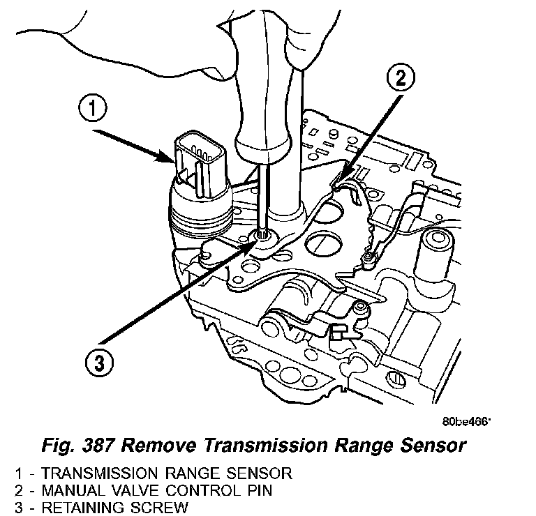2. Remove transmission range sensor retaining screw (3) (Fig. 387) and remove sensor (1) from valve body