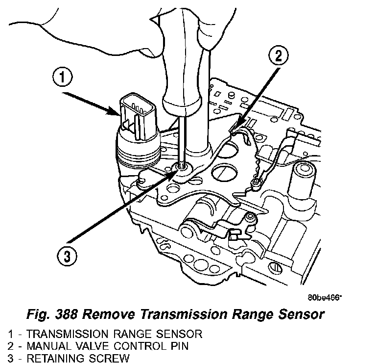 1. Install transmission range sensor (TRS) (1) (Fig. 388) to the valve body and torque retaining screw (3) to 5 Nm (45 inch lbs.).