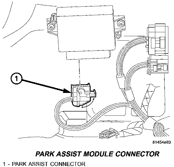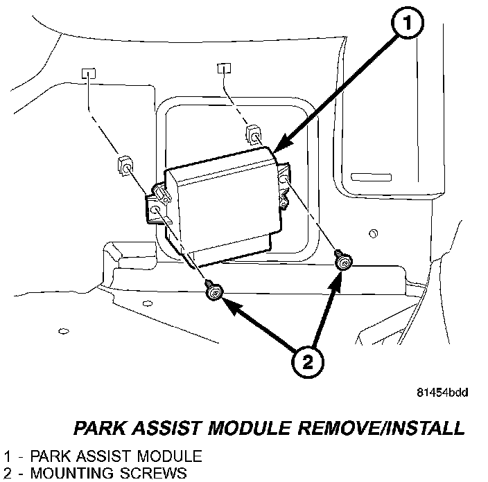 1. Position the Park Assist Module and install the two attaching screws. Torque screws to 3.5 N.m (30 in. lbs.).